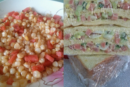 火腿需要用热油炒一些,然后和黄瓜、玉米搅拌在一起。准备好1片面包,将拌好的食材铺在上面,挤上一些沙粒酱,再铺上一块吐司。用刀切成三角形就完成了。