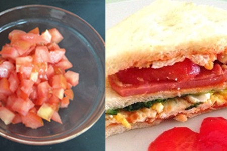 将吐司面包平铺好,放上西红柿,再盖上一块面包,还要放入之前煎好的鸡蛋,上面一层也需要盖上吐司,用刀沿着对角线切开。