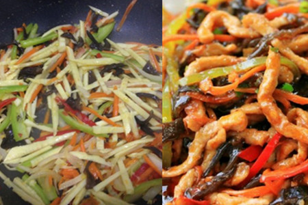 腌制好的里脊肉非常鲜嫩,可以和鱼肉媲美。先将里脊肉放在锅中翻炒,在逐次加入木耳、青椒、胡萝卜一同翻炒。肉差不多熟了之后,就能加入酱油、盐、鸡精等调味料了。将调味料翻炒均匀以后,出锅即可。
