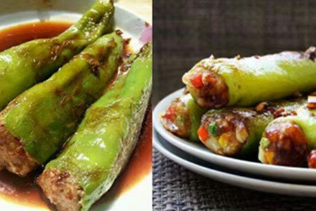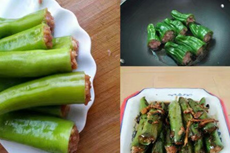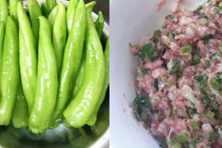 下面再给大家介绍一道荤的虎皮青椒——肉酿虎皮青椒。首先我们要准备的原材料有猪肉馅、尖椒、鸡蛋、酱油、盐、料酒、花椒、糖。把猪肉馅放入碗中加入料酒、盐、糖、鸡蛋清、淀粉然后顺着一个方向搅拌均匀待用。接下来把青椒清洗干净挖掉里面的籽,然后将刚刚准备好的猪肉馅塞在辣椒里,塞的时候不要塞的太满了。