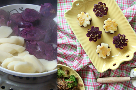 紫薯和山药都是非常有营养的两种食物,将这两者相结合一起制作成糕点是非常滋补的。首先,我们需要将山药和紫薯分别去皮,同时将它们切成块状,然后上锅将它们蒸熟。然后,我们需要将它们放凉,同时再用叉子或者勺子将它们碾压成泥。