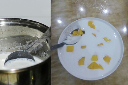 与此同时,我们还需要准备吉利丁片和一些水果,比如芒果。接下来,我们需要隔着水将吉利边片慢慢溶解,然后我们需要将溶解后的吉利丁片倒入椰奶汁中,并用锅将椰奶煮制一段时间,同时我们需要用勺子不停的搅拌它。