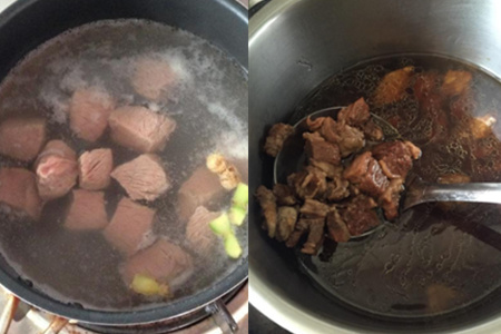 牛腩冷水下锅焯水,出血沫之后捞出,放在电饭煲中,然后一起加入姜片,八角,香叶,倒入足够多的热水。