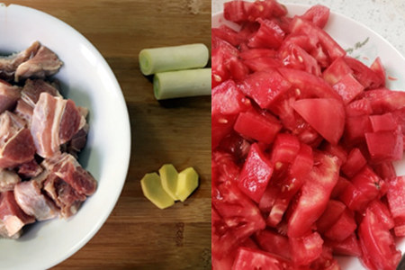 先将牛腩清洗干净,然后切成大小适中的方块。接着清洗西红柿,姜和大葱。