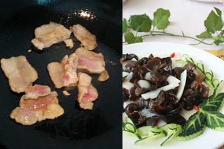 4、利用锅中剩余的油,倒入泡发好的木耳翻炒片刻后。因为木耳很容易熟,所以不需要炒制过久。再往锅中加入沥干多余水分的山药和瘦肉,加上些盐、少许的酱油进行调味。翻炒均匀,炒制山药熟透就可以食用了。【女物原创未经允许,谢绝转载!】