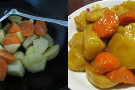 锅中加入色拉油加热后将葱花、姜丝和大蒜头放入爆香 。加入土豆块和胡萝卜块一起翻炒,加入200毫升清水。等汤汁沸腾后加入咖喱块和酱油,盖上锅盖闷煮10分钟,。等汤汁变得浓稠后加入味精和盐进行调味,开大火进行收汁。