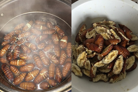 实际上,直接用油炸蚕蛹的油脂含量过高,经常食用这样的食物可能会给我们的身体造成一些负担。因此,我们要先用水将它焯一遍,这样我们便不用将它用油炸。接下来,我们需要将焯好的蚕蛹沥干水分,同时再将它撕成两半,这样更方便我们去除掉它里面的脏东西。
