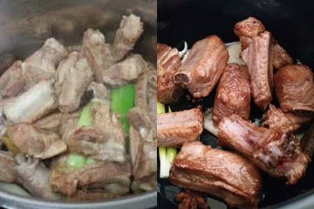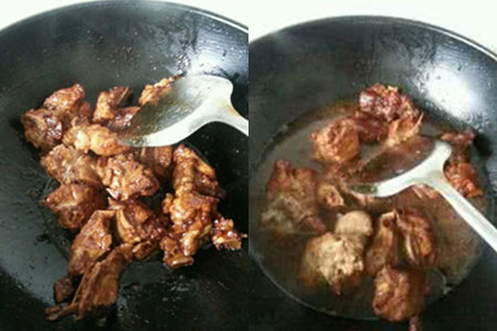 第七步:翻炒排骨三分钟之后,加入酱油,酱油刚好漫过排骨,改为中火烹煮。