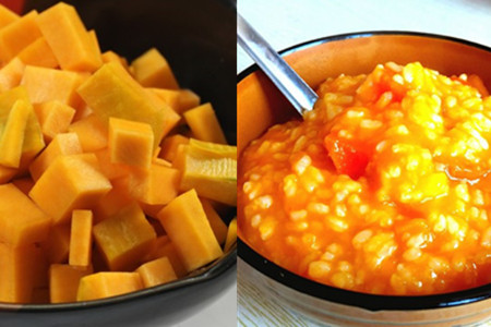 另一种做法是香甜易消化的南瓜粥。这道粥品的做法也比较地简单。首先,用清水把南瓜清洗干净,然后用刀把它的外皮削掉,把里面的籽挖掉并将其切成较小的块状备用。