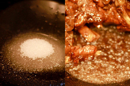 第八步:继续中火热锅,放入五茶匙的白糖,轻轻搅拌的过程中,不停的倒入细流的醋,等待白糖变成糖浆。