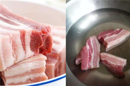 猪肉放入清水清洗干净后放入锅中,加入适量的清水,开大火煮沸2分钟。将猪肉捞出洗去肉表面的浮沫,再拿一个干净的锅。