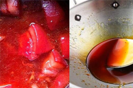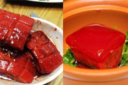 饭店的红烧肉一般都是色泽鲜亮而且猪肉酥而不烂,家里的红烧肉一般颜色都是深棕色有的甚至都变成黑色了,而且家里红烧肉有时候口感比较老。