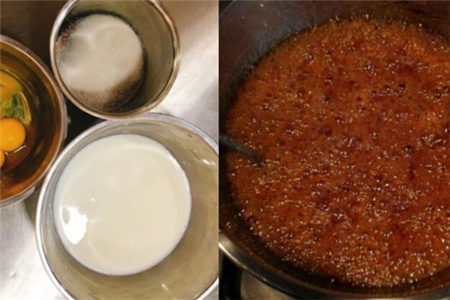 接着将白糖放入锅中融化,开小火慢慢熬制,等糖浆颜色从透明变成深棕色的时候关火。趁热将糖浆倒入事先准备的模具里,模具一般选用底小口大的杯状物,这样做出来的外观比较好看,焦糖的步骤完成。