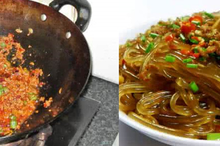 关键的环节是对粉丝的处理,在正式开火之前,要用热水将粉丝浸泡,一般2个小时,如果时间过长下锅后易黏。油的温度不要太高,火候小一点。翻炒速度要快,必要时把锅拿起来抖一抖,粉丝不黏锅的时候放调味品,如果放得过早,调味品和粉丝搅和后更容易糊。