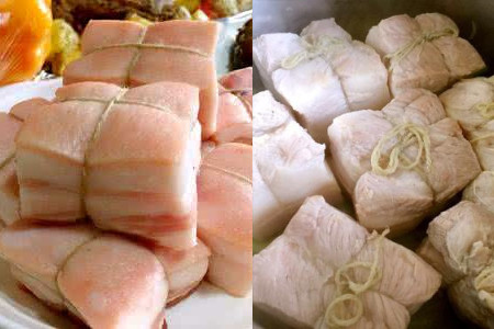 接着,我们要把猪肉洗干净,用刀把猪毛刮干净,然后把有猪皮的一面放到火上面烧一下,这样才可以把猪毛去除干净,然后再用刀刮一下,洗干净,把猪肉切成五厘米左右长的方块,用新鲜的稻草把猪肉块捆成十字状即可。
