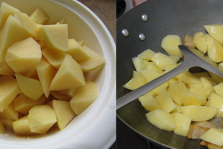 第四步,在干净的锅中倒入适量的食用油,点火加热后放入一些蒜片并炒出蒜香。然后倒入处理好的土豆继续翻炒,一直到土豆的颜色变为透明为止。