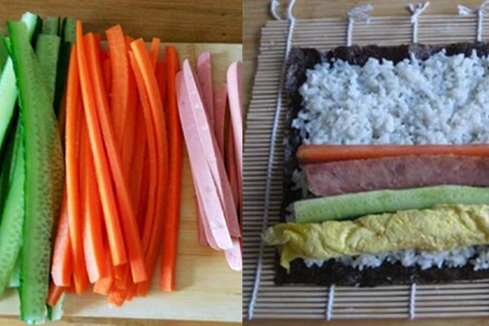 第四部,将煮好的米饭倒进一点醋,搅拌均匀后,平铺在海苔上面。这时将之前切好的各种条状蔬菜瓜蛋放在上面。