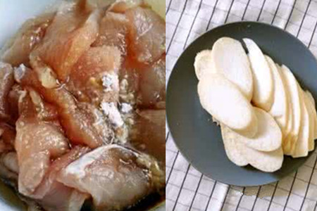 1、先将买回来的新鲜的瘦肉洗净表面的血水,把瘦肉用刀切成薄片。加入适量的料酒、盐、生抽、淀粉、油进行抓捏,腌制大概半个小时左右。加入些淀粉,可以使瘦肉吃起来更加嫩滑爽口。
