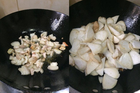 3、所有的食材准备好后,就可以开始烹饪食材了。在炒锅中倒入适量的油,油温加热至七八成时。把猪肉片倒入锅中,大火翻炒至变颜色后铲出在盘中。