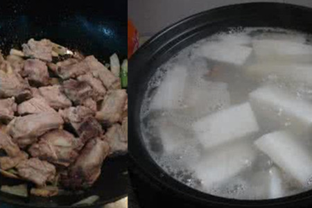 3、这时候再加入白萝卜块,用铲子翻炒片刻。加入没过食材的水,熬煮半个钟头就可以食用了。【女物原创未经允许,谢绝转载!】