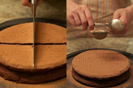 将巧克力面糊倒入蛋糕模具中,放进烤箱烤至半小时,取出后将蛋糕切成两片,把榛子酱涂在一片上,然后盖在另一片上面,这样就做成了夹心,静置一会后,巧克力浆会慢慢流动覆盖整个蛋糕,切块即可食用。【女物原创未经允许,谢绝转载!】