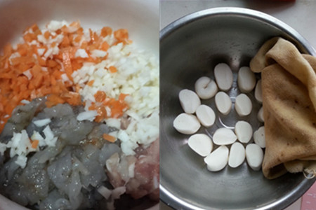 那么,这一道有名的小吃又是怎么制作而成的呢?下面便来介绍一下它的具体制作方法。首先,准备好要用的的所以食材。其中包括新鲜的虾三百克,猪肉一百五十克,胡萝卜半根,澄粉两百克,大葱半根,淀粉八十克,生姜一小块,食盐、酱油、油少许。