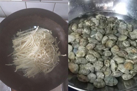 1、准备的食材有蛤蜊、鲜虾、金针菇、日本豆腐、葱姜、香菜。