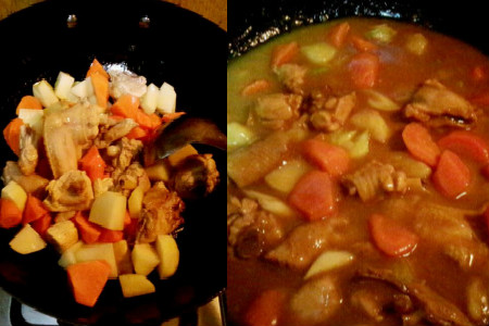 炒勺内放一点油,将土豆略微煎一煎,取出备用。再次将油锅加热,放入洋葱进行翻炒,然后放入鸡块和土豆,加上水,水量要够,应该没过所有的食材。这时候可以放入咖喱了。可以是咖喱块,也可以是咖喱粉。