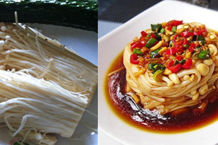 将辣椒、大蒜洗干净拍成碎末状态,油锅里面倒入一些食用油,将辣椒、大蒜、盐倒进去炒香。然后将烧好的油淋在金针菇上面。