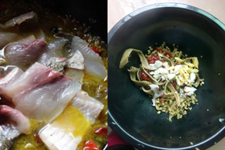 炒好之后加入适量的清水煮开锅,把腌制好的鱼片慢慢地滑到锅中。