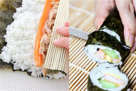 将海苔加热后,放在竹帘上,然后用手把米饭捏软,均匀地铺在海苔上并压实,注意要将海苔空出两厘米。然后我们就可以把配料放在米饭中间了,再用竹帘将海苔和米饭一同裹起来,卷紧之后拿走竹帘。用刀将寿司切成段,就大功告成了。【女物原创未经允许,谢绝转载!】
