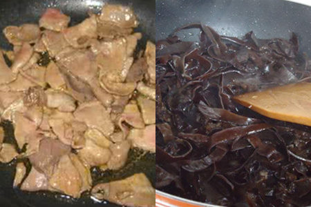 第七步:继续往锅中倒入少许的食油,保持火候,放入木耳,翻炒三分钟。