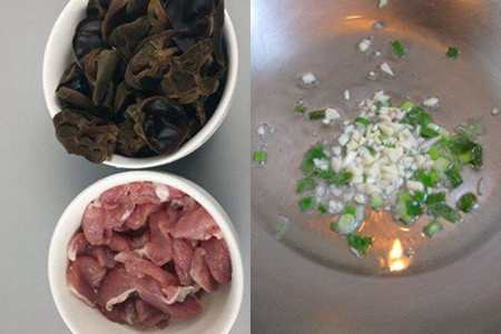 第一步:准备食材。主要食材有新鲜木耳100克,新鲜瘦肉250克,辅助食材有蒜头两瓣,生姜两片,油,盐。