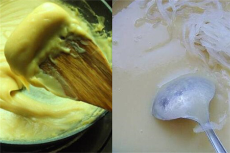 接着将琼脂加水放入锅中加热至融化,加入白糖和豌豆沙一起加热。一边加热一边搅拌,等锅中的馅料变得黏稠的细沙时加入蜂蜜,再次搅拌均匀就可以关火了。