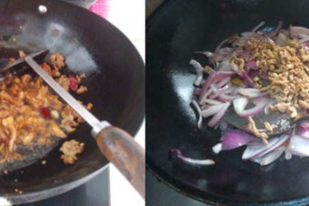 接着将洋葱外面的干皮全部剥掉,洗干净之后用刀切成小块儿。(大家都知道切洋葱的时候会使人掉眼泪,这时候我们可以在旁边放一盆清水,这样就不会掉泪了)在锅里加入适量的油等油烧热了之后加入干辣椒和姜、蒜一起爆香。接着再将牛肉放入锅里翻炒,等到牛肉炒熟了之后就盛出来备用。(炒牛肉的时候一定要用大火快炒,这样才嫩滑)