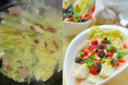 娃娃菜的做法二:制作材料:娃娃菜1棵、皮蛋1个、火腿2根、高汤1碗半、蒜末适量、小红椒2根、枸杞适量。制作步骤:首先把娃娃菜洗干净,切成若干份,皮蛋和火腿切粒,蒜蓉和小红椒切碎备用。热锅放油,先放蒜末、小红椒、枸杞、皮蛋和火腿下去翻炒。3分钟后,倒1碗高汤下去,再放娃娃菜煮,加入盐和酱油。待娃娃菜变软后,即可出锅。