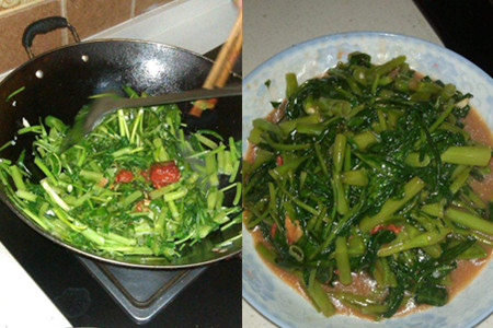 空心菜的做法二:制作材料:空心菜1把、腐乳适量、蒜末适量、辣椒酱适量。制作步骤:首先将空心菜洗干净,沥干水,除去梗,择成小段,蒜蓉切末备用。待锅热后,倒花生油,再放蒜末爆一下。然后倒入空心菜翻炒,再加少许水以免粘锅。待空心菜变软后,放盐、酱油、腐乳和辣椒酱下去调味。3分钟后便可出锅。