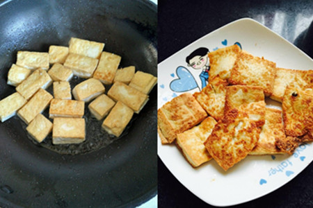 我们先将豆腐放在开水锅里焯一下,然后将豆腐切成正方形的块儿,切的厚度要适中,不能切的太薄了。接着将锅洗净然后在锅里加入适量的油,等油烧至六七分热的时候将豆腐一片一片的放入锅里煎。等到一边煎黄了之后,再翻过来煎另一边,两边都煎至金黄色的时候就盛出来备用。干辣椒切成段,尖椒切成丝,蒜切成片,姜切成丝备用。