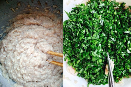 六、加入洗净晾干、切碎的韭菜、葱姜沫,适量食用油搅拌均匀。