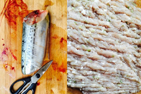 二、将鲅鱼去掉头尾只留中间部分,片成两片以后,用小勺子把鱼肉刮下来。一方面可以去掉鱼皮,另一方面可以让肉质细腻,这是一个很好用的小诀窍。在鱼肉中加少许盐,加入五花肉充分剁碎,一边剁一边加少量水。一定要先加盐,可以让鱼胶释放,口感更Q弹。