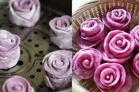 只有少量多次加入才可以使面团柔和的特别均匀。在面团揉好之后,我们便需要用刀将它切成小块,同时再将每一块做成花卷。除此之外,我们也可以将它做成紫薯玫瑰花卷。我们需要将面团揉成小球,同时再用擀面杖将它擀成薄片,然后在上面撒适量的面粉,这样可以防止花瓣粘在一起。