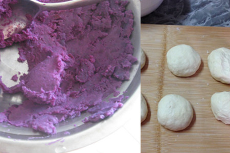 这时,我们需要在盆里面倒入适量的面粉,同时在面粉里加入水,然后用筷子不停的搅拌它,接着我们便可以用手开始揉面了。在面团揉好之后,我们需要将事先准备好的紫薯泥一点点放入面团之中。我们一定不要一次性就将全部的紫薯泥加入面团中,这样会很难将它揉合好。