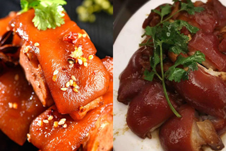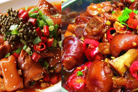 做法:新鲜猪蹄去干净毛后洗干净,切成块。锅里面加入清水,煮沸腾之后把处理好的新鲜猪蹄放进去焯掉猪骚味。把猪蹄块放进油里面炸到微焦后捞出来。锅里面放油、大料粉、葱蒜姜炒出香味,再加绍兴酒和白冰糖、清水、猪蹄块,小火煮1个小时后出锅。把花椒粒和干红辣椒用油炒到微黄淋在猪蹄块上就完成了。