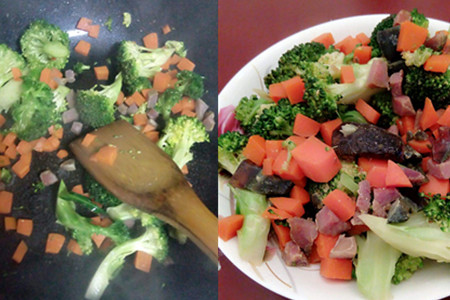 西兰花的做法二:制作材料:西兰花、红萝卜、腊肉、火腿、皮蛋、高汤。制作步骤:首先把西兰花掰成小块,红萝卜、腊肉和火腿切粒,皮蛋切块。然后煮一锅热水,水开后,把西兰花放进热水里汆烫下捞出待用。接着热锅放油,再把所有食材都倒进去。3分钟后,放入高汤,加盐、酱油和鸡精调味。十分钟后便可出锅了。