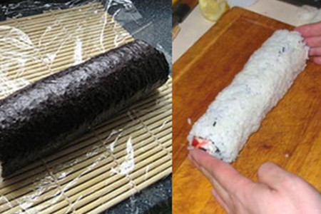 将内容物铺好后就开始较为重要的一步:利用寿司帘卷裹。从寿司帘一侧拿起轻轻地往里卷,在卷的过程中不要太紧,否则到后面会发现有内容物被挤出来。力度应该拿捏在不轻不重,正好可以把内容物包完的程度。并且在卷裹的时候还是要时不时留意一下已经卷进去的那一部分看是否有内容物从两侧被挤出。