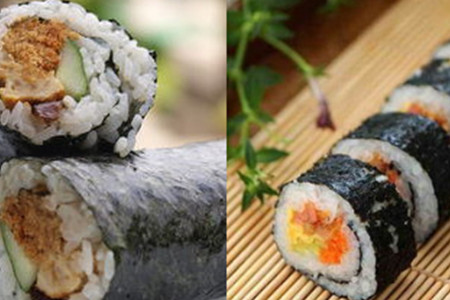 只是要注意米饭一定不要太多,均匀铺薄薄一层就好。然后放置一些自己喜欢的蔬菜或者肉类。在这简单说一下,要想吃出健康与美味的话,还是要注重内容物的搭配。比如尽量是多素少荤,素菜可以是胡萝卜条和黄瓜条或者生菜,这些都是较为营养并且常见的素菜。荤菜可以是虾肉、鱼肉等海鲜类。然后可以浇上点沙拉酱或者其他酱类。