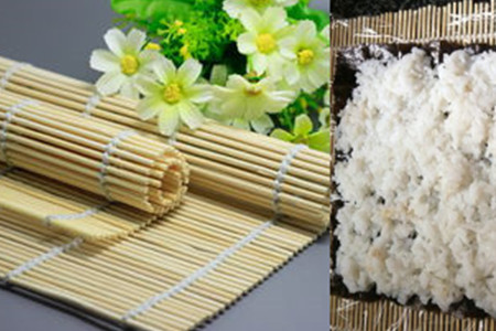 寿司的做法比较简单。在制作过程中我们需要用到一个工具:寿司卷,也就是竹条制成的一种小密帘。它的作用就是帮助我们更好的裹卷寿司。制作寿司需要用到的材料也比较简单:大块的海苔片、熟米饭、还有裹卷在寿司里面的一些蔬菜和酱类等等。首先呢肯定是先煮好米饭待它自然冷却。将寿司卷平铺,放上海苔片,然后取适量米饭均匀铺展与海苔片上。