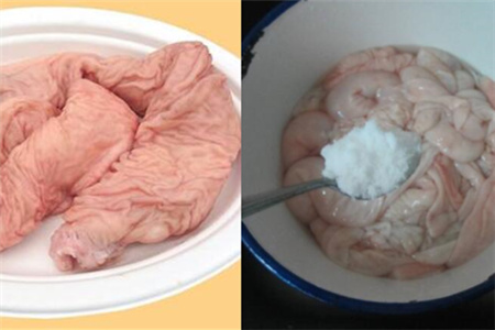 将猪大肠用清水冲洗干净,将面粉均匀的涂抹在大肠内外两侧,然后使劲的搓。