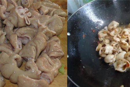 接着用清水将大肠再次冲洗干净,将大肠放入沸水中汆烫至熟。将大肠捞出,切成3厘米左右的小段,放入油锅中煎炸至金色捞出备用。