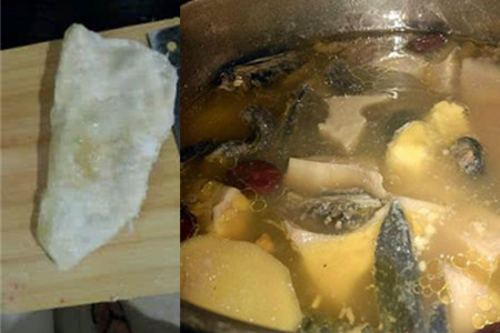 榴莲壳中有层非常厚的白瓢,其实也是可以用来煲汤的。不仅可以去除鸡汤的油腻,而且会使煲出来的汤更加清香。把白瓢用刀切下,切成些许的小块。榴莲的核也可以煲汤,它性情比较温和,具有补肾的功效。